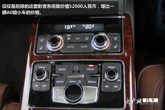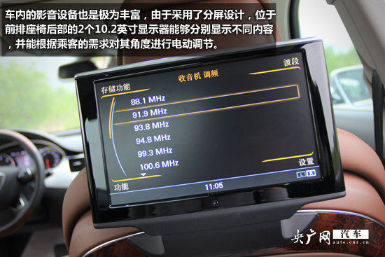 車內(nèi)的影音設(shè)備也是極為豐富,由于采用了分屏設(shè)計,位于前排座椅后部的2個10.2英寸顯示器能夠分別顯示不同內(nèi)容,并能根據(jù)乘客的需求對其角度進行電動調(diào)節(jié),配合兩個獨立的耳機插孔,使后排乘客能互不影響的使用視聽系統(tǒng)。僅僅是后排的這套影音系統(tǒng)就價值52000人民幣,堪比一輛A0級小車的價格。A8L采用Bose環(huán)繞音響系統(tǒng),重低音效果極強。600瓦數(shù)碼功放、14聲道14喇叭、可讓駕乘者盡情沉醉于美妙的音樂聲中。