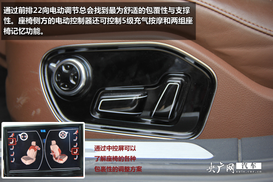A8L的座椅采用了棕紅色的Valonea真皮制作,極為舒適。通過前排22向電動調(diào)節(jié)總會找到最為舒適的包覆性與支撐性。座椅側(cè)方的電動控制器還可控制5級充氣按摩和兩組座椅記憶功能。同時,通過中控臺上的相應(yīng)按鍵也可以開啟座椅通風、座椅加熱功能。