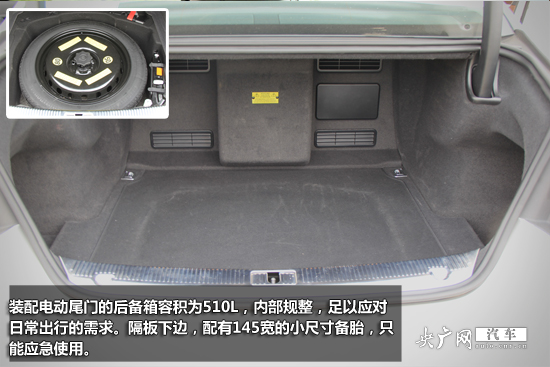 儲物方面,A8L的表現(xiàn)也相當優(yōu)異。車內(nèi)手套箱、前后扶手箱、門板儲物格等等一應(yīng)俱全,儲物格內(nèi)也都會用軟膠或絨布鋪墊,減少噪音。裝配電動尾門的后備箱容積為510L,內(nèi)部規(guī)整,足以應(yīng)對日常出行的需求。隔板下邊,配有145寬的小尺寸備胎,只能應(yīng)急使用。