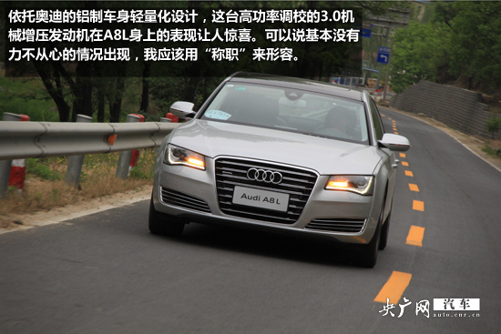 依托奧迪的鋁制車身輕量化設(shè)計,這臺高功率調(diào)校的3.0機械增壓發(fā)動機在A8L身上的表現(xiàn)讓人驚喜。可以說基本沒有力不從心的情況出現(xiàn),我應(yīng)該用“稱職”來形容。
