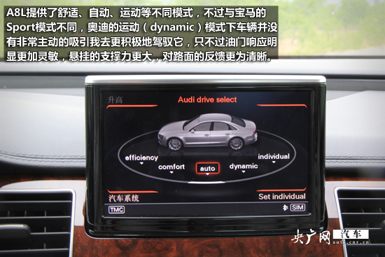 駕駛模式方面,A8L提供了舒適、自動、運動等不同模式,不過與寶馬的Sport模式不同,奧迪的運動(dynamic)模式下車輛并沒有非常主動的吸引我去更積極地駕馭它,只不過加速時的油門響應(yīng)明顯更加靈敏,懸掛的支撐力更大,對路面的反饋也更為清晰,一般情況下不建議帶著老板體驗這種感覺。但是,不論哪種模式,A8L的動力總給我一種武俠高手內(nèi)功至臻化境,輸出源源不斷的感覺,甚至達到180公里時速時,柔和的動力輸出依然充沛飽滿,只是限于路況我不能開的再快了。
