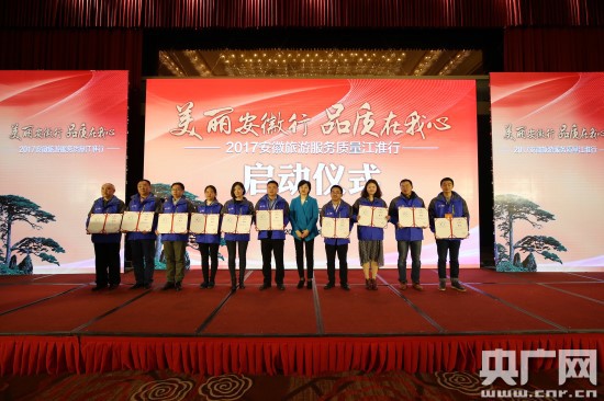 啟動(dòng)儀式宣布“2017安徽旅游服務(wù)質(zhì)量江淮行”正式啟動(dòng),現(xiàn)場省旅游發(fā)展委員會(huì)副主任王靖為“2017安徽旅游服務(wù)質(zhì)量江淮行”活動(dòng)授旗,合肥市、阜陽市、黃山市旅游部門負(fù)責(zé)同志上臺(tái)接旗。