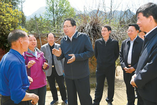 4月13日,省委書記李錦斌來到金寨縣花石鄉(xiāng)大灣村,與貧困戶陳澤申親切交談,細算脫貧賬,并祝賀他即將喜遷新居。吳文兵攝