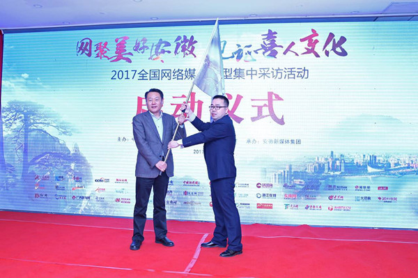 安徽省委常委、宣傳部長虞愛華為參加活動(dòng)的網(wǎng)絡(luò)媒體記者代表授旗。