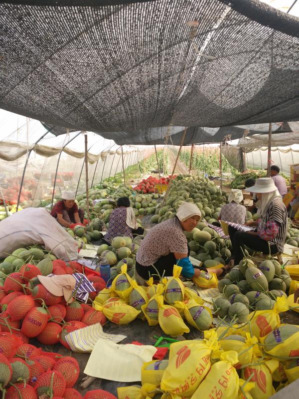 哈密瓜喜獲豐收,工人們正在大棚內(nèi)分類包裝