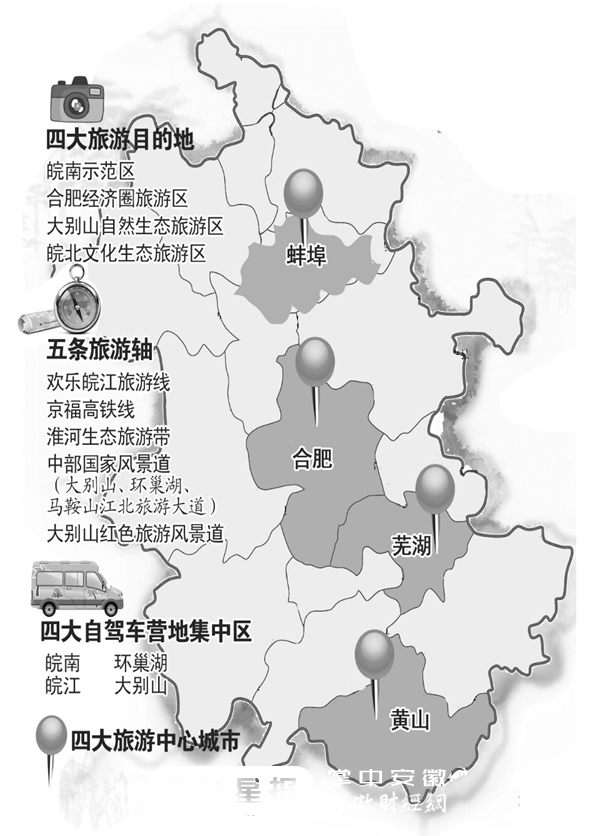 率先啟動(dòng)建設(shè)合肥、黃山、蕪湖市三大自駕游中心城市;以皖南、環(huán)巢湖、皖江、大別山為重點(diǎn)發(fā)展區(qū)域,兼顧皖北、皖中地區(qū)發(fā)展需求,建設(shè)150個(gè)自駕車(房車)營地、露營地,形成皖南、環(huán)巢湖、皖江、大別山等四大自駕車營地集中區(qū);建設(shè)大別山自駕車風(fēng)景道、皖南自駕車風(fēng)景道、環(huán)巢湖自駕車風(fēng)景道;建設(shè)20個(gè)自駕車綜合服務(wù)中心和500個(gè)自駕車服務(wù)驛站。