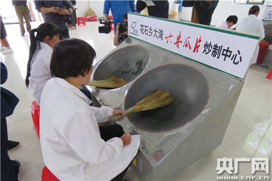 央廣網(wǎng)安徽頻道4月19日六安消息(記者徐秋韻)4月18日,“六安瓜片”炒制實訓(xùn)班在大灣一笑堂茶廠舉辦,根據(jù)金寨縣農(nóng)業(yè)發(fā)展委員會統(tǒng)一部署,花石鄉(xiāng)依托一笑堂茶葉公司,給新型職業(yè)農(nóng)民培訓(xùn)六安瓜片炒制作技能。本次培訓(xùn)從4月16日即已開始!坝貌璋堰M(jìn)行翻炒,注意用力適當(dāng)”,記者在培訓(xùn)現(xiàn)場也學(xué)到了一些與炒茶相關(guān)的新名詞。