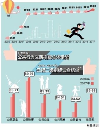 2017年北京市民公共行為文明指數(shù)發(fā)布:首次突破85,達(dá)85.68,比2016年提升了1.5個分值;與2005年相比,這個數(shù)字上升了20.47。調(diào)查顯示,公共交往、公共觀賞、公共參與指數(shù)大幅上升,而“隨地吐痰”“闖紅燈”“不進(jìn)行垃圾分類”依然是受訪者眼中最不文明的行為。