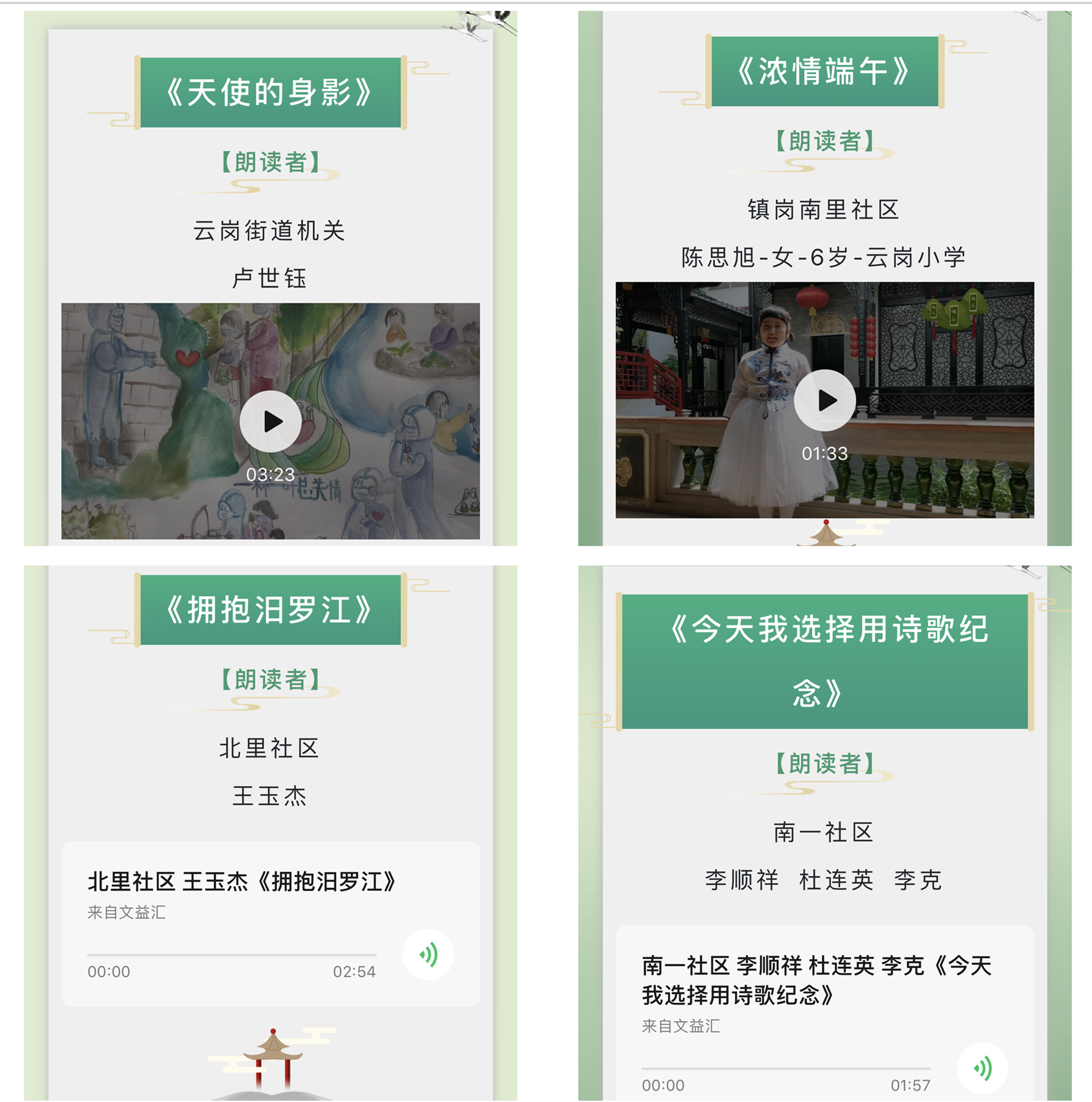 “往年端午節(jié),都是在線下以各種形式舉辦活動(dòng),弘揚(yáng)家國(guó)情懷、感受中華優(yōu)秀傳統(tǒng)文化、寄托美好愿望。疫情期間,為防止人流密集、保證居民身體健康,目前還不能開展聚集性活動(dòng),通過‘互聯(lián)網(wǎng)+文化’的形式,讓轄區(qū)居民朋友們匯聚‘云端’,在感受傳統(tǒng)文化魅力的同時(shí),學(xué)習(xí)防疫知識(shí),用聲音、用畫筆為抗疫加油鼓勁!”云崗街道辦事處社區(qū)建設(shè)辦公室副主任李明輝說。