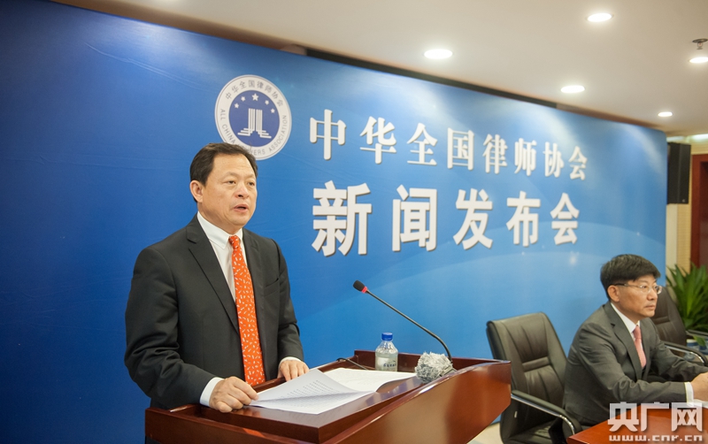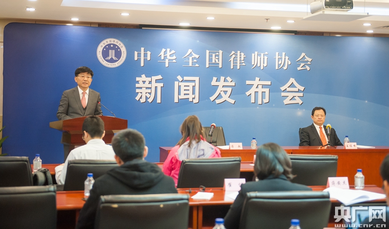 全國(guó)律協(xié)副會(huì)長(zhǎng)、新聞發(fā)言人、全國(guó)律師行業(yè)黨委委員蔣敏主持新聞發(fā)布會(huì)