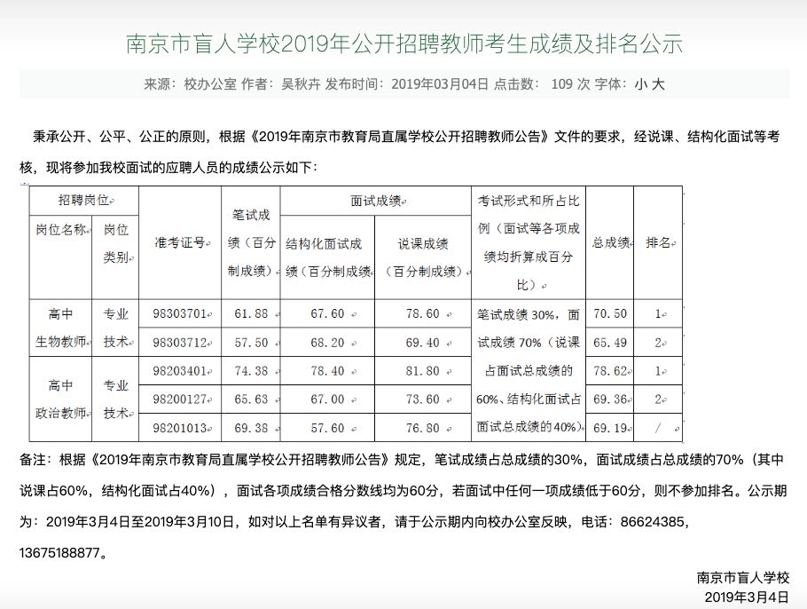 記者在南京市盲人學(xué)校網(wǎng)站上看到,鄭榮權(quán)的筆試和面試總成績(jī)名列第一位。但面試通過(guò)后,他的體檢結(jié)論為“不合格”,主要是因?yàn)橐暳?wèn)題。鄭榮權(quán)認(rèn)為,他完全有能力勝任盲校的教師崗位。他說(shuō):“不論從我個(gè)人的實(shí)踐經(jīng)歷來(lái)說(shuō),還是從已經(jīng)在盲校工作的教師來(lái)說(shuō),或者是相關(guān)專(zhuān)家的研究,沒(méi)有一個(gè)實(shí)例證明盲人不能在盲校教書(shū)。”