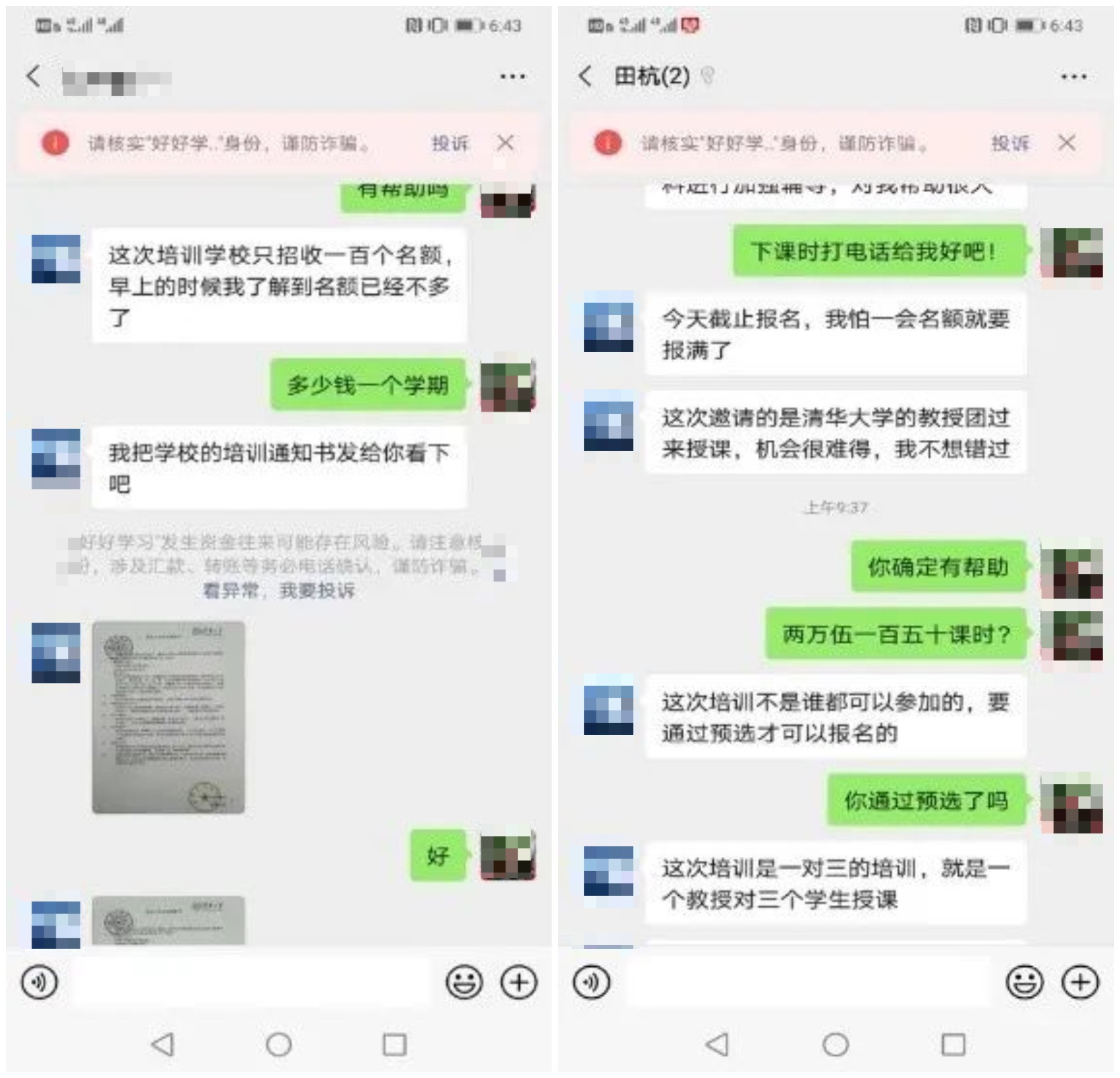 同樣是在上個月,安徽合肥的張女士一天在上班時收到了一條自稱是自己孩子的QQ信息,由于工作忙,張女士同樣沒想太多。在添加QQ好友后,對方稱當?shù)亟逃盅埖角迦A大學資深教授到學校培訓,自己通過篩選得到了寶貴的培訓名額,急需交一筆4萬元的報名費。張女士說:“他當時說,‘媽,我是誰誰誰,’我就以為他是我家的孩子。然后因為錢有點多,我一直沒想著報,但是今天下午3點就截止了!