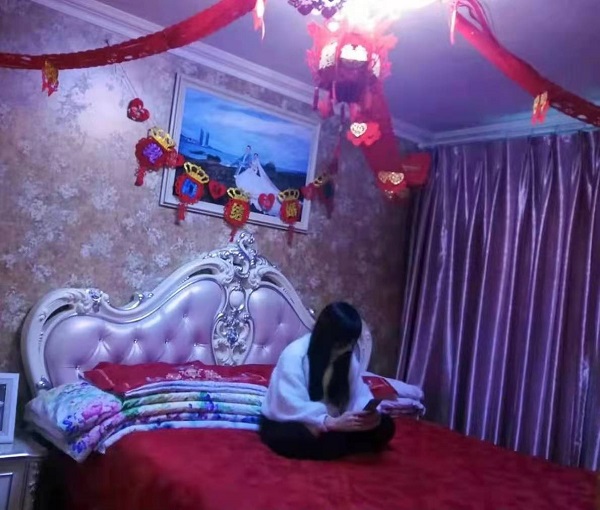 新婚之夜范慧嫻在布置一新的婚房里翻看著兩人的婚紗照(受訪者供圖)