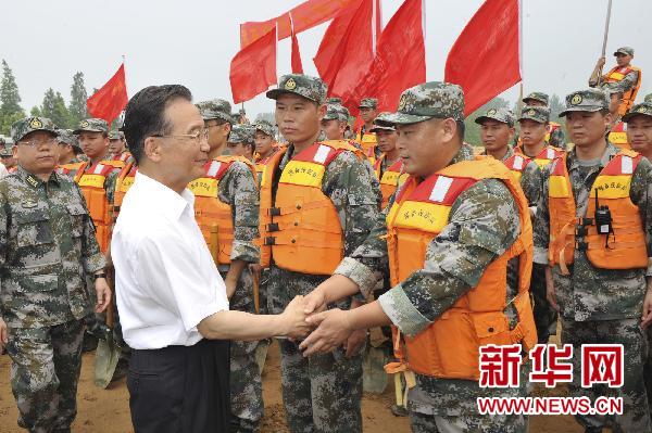 7月24日,中共中央政治局常委、國務院總理溫家寶在安徽檢查指導淮河防汛抗洪工作。這是在淮河大堤旁的防汛石料儲備點,溫家寶慰問在抗洪第一線的解放軍、武警和民兵預備役官兵。 新華社記者 黃敬文 攝