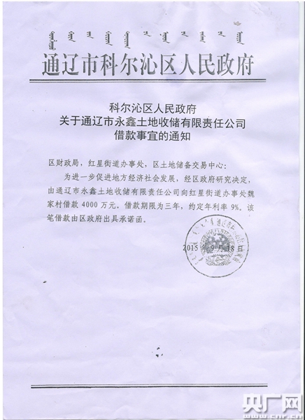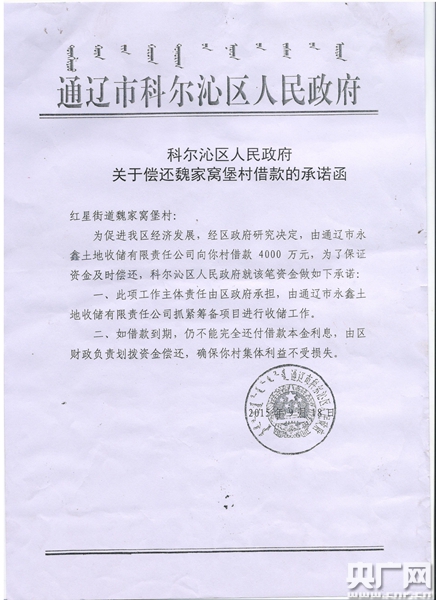 魏家窩堡村書記朱玉國(guó)告訴記者,借貸風(fēng)險(xiǎn)可控,因?yàn)橛挟?dāng)?shù)卣膿?dān)保。據(jù)村民們提供的《科爾沁區(qū)人民政府關(guān)于償還魏家窩堡村借款的承諾函》記載:“為促進(jìn)我區(qū)經(jīng)濟(jì)發(fā)展,經(jīng)區(qū)政府研究決定,由通遼市永鑫土地收儲(chǔ)有限責(zé)任公司向你村借款4000萬(wàn)元,為了保證資金及時(shí)償還,科爾沁區(qū)人民政府就該筆資金作如下承諾:一、此項(xiàng)工作主體責(zé)任由政府承擔(dān),由通遼市永鑫土地收儲(chǔ)有限責(zé)任公司抓緊籌備項(xiàng)目進(jìn)行收儲(chǔ)工作。二、如借款到期,仍不能完全還付借款本金利息,由區(qū)財(cái)政負(fù)責(zé)劃撥資金償還,確保你村集體利益不受損失!