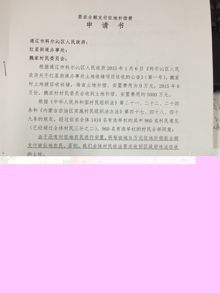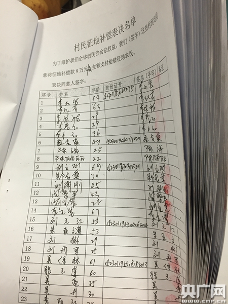 至今,對(duì)于這樣的分配方式,當(dāng)?shù)卮迕袢圆荒芙邮。采訪中,他們還向記者提供了一份《要求全額支付征地補(bǔ)償費(fèi)申請(qǐng)書》,《申請(qǐng)書》中寫道:“經(jīng)過征求全體1410名有選舉權(quán)的其中960名村民意見(已經(jīng)超過全體村民三分之二),960名有選舉權(quán)的村民全部同意:由于沒有對(duì)征地農(nóng)民進(jìn)行安置,將每畝地9萬(wàn)元征地補(bǔ)償款全額支付被征地農(nóng)民!备巾(yè)中是960名村民的征地補(bǔ)償表決名單,共計(jì)44頁(yè)。