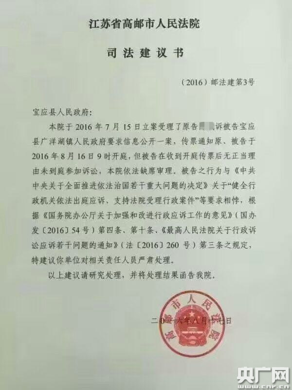 央廣網(wǎng)高郵8月27日消息(記者管昕 郭翔宇)據(jù)中國之聲《新聞晚高峰》報(bào)道,“告官不見官”,在行政訴訟的司法實(shí)踐中,一直是常見的現(xiàn)象。近日,江蘇高郵市法院就針對(duì)官員未出庭應(yīng)訴,發(fā)出的一份司法建議書,引起不少人的關(guān)注。一名群眾要求寶應(yīng)縣廣洋湖鎮(zhèn)政府信息公開,并將其告上法庭,但鎮(zhèn)政府無正當(dāng)理由未到庭參加訴訟,法院最終依法缺席審理。高郵市法院向鎮(zhèn)政府的上級(jí)寶應(yīng)縣政府發(fā)出司法建議書,建議對(duì)相關(guān)責(zé)任人員嚴(yán)肅處理,并要求將處理結(jié)果函告法院。高郵市和寶應(yīng)縣同為江蘇揚(yáng)州的下轄行政區(qū)域,這一跨區(qū)域的罕見做法,讓群眾拍手叫好,也獲得司法界人士的點(diǎn)贊。