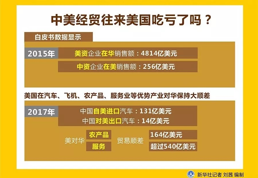 相關(guān)的數(shù)據(jù)也顯示,美國在多領(lǐng)域?qū)θA保持大順差。傅自應指出:“美國在汽車、飛機、農(nóng)產(chǎn)品、服務業(yè)等優(yōu)勢產(chǎn)業(yè)都對華保持大順差。2017年中國自美進口汽車131億美元,對美出口汽車14億美元。美對華農(nóng)產(chǎn)品貿(mào)易順差達到164億美元。美對華服務貿(mào)易順差超過540億美元。”