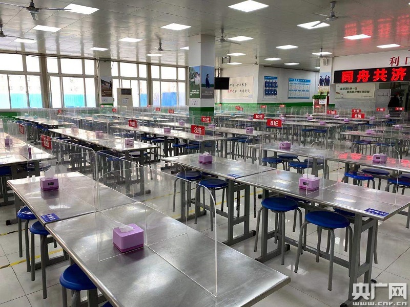 記者在食堂內(nèi)看到,每個(gè)座位上都用透明塑料板做了間隔。婁延果說:“擋板是透明的。我們當(dāng)時(shí)的考慮是,要讓同學(xué)們互相之間還能看得到,都是自己的同學(xué),感覺親切一點(diǎn),但是擋板要把每個(gè)人的就餐位置隔開,所有同學(xué)都在擋板前吃飯!