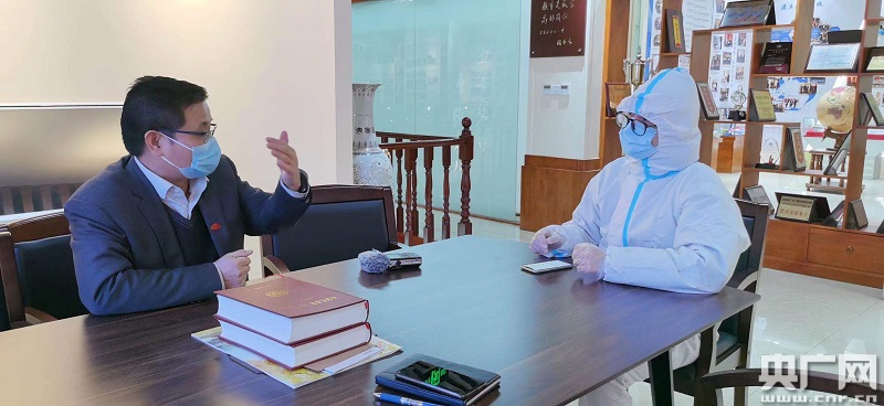 校長婁延果接受總臺(tái)央廣記者采訪(按照防疫要求進(jìn)入學(xué)校的人員必須穿戴防護(hù)服)