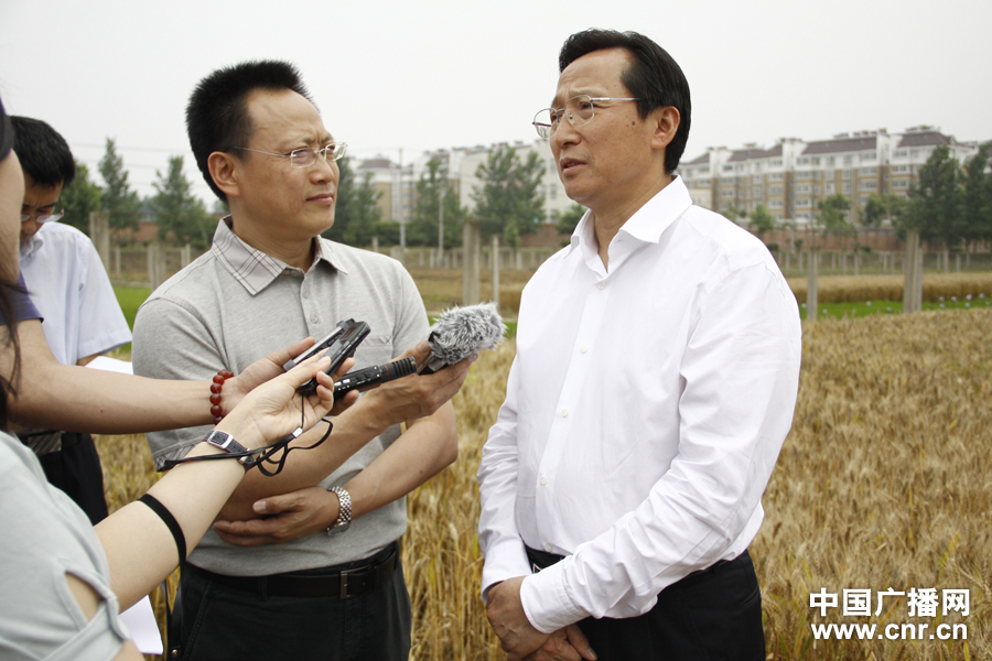 31日,中央臺(tái)《傾聽安徽》報(bào)道組赴合肥了解全國(guó)夏糧生產(chǎn)的總體形勢(shì)以及保障農(nóng)民權(quán)益的各項(xiàng)措施。圖為記者趙子忠在田間地頭采訪了農(nóng)業(yè)部部長(zhǎng)韓長(zhǎng)賦。(中廣網(wǎng)記者劉夢(mèng) 攝)