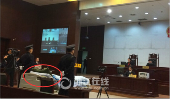 包來(lái)旭是當(dāng)時(shí)受傷最重的一名傷員,全身燒傷面積達(dá)到95%以上,后來(lái)經(jīng)過(guò)醫(yī)院治療,雙腿腳踝以下的部分已經(jīng)被截肢。今天在審判長(zhǎng)宣布開庭的時(shí)候,包來(lái)旭被四名警察抬上了法庭的被告席,包來(lái)旭躺在病床上出庭受審。