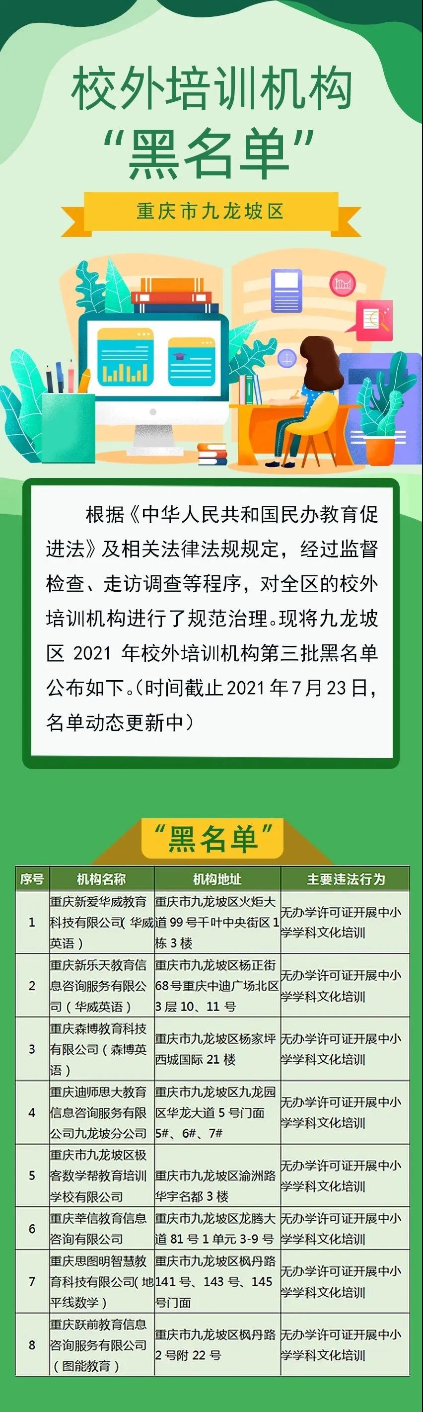 九龍坡區(qū)2021年第三批校外培訓(xùn)機(jī)構(gòu)“黑名單”公布。