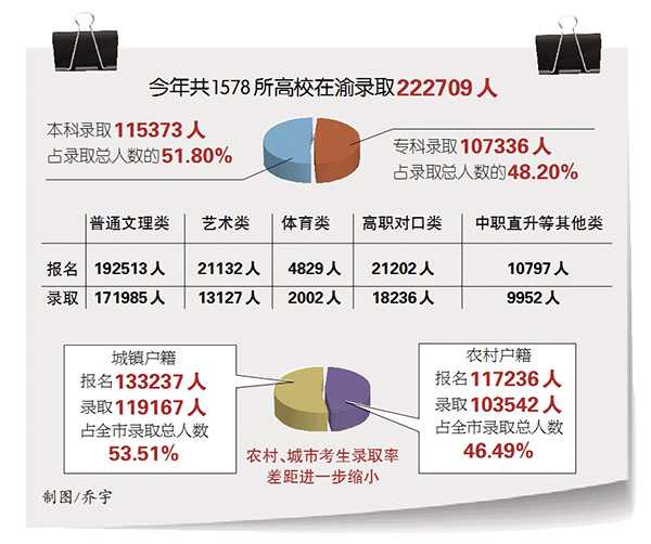 8月14日,市教育考試院發(fā)布消息,我市2018年普通高校招生錄取工作全部結(jié)束。今年全市高考報(bào)名共250473人,在渝招生高校共1578所,各類各批次共錄取222709人,本、?其浫∪藬(shù)幾乎各占一半。值得提醒的是,未被錄取的考生還有最后一次?蒲a(bǔ)錄的機(jī)會,填報(bào)志愿的時(shí)間是9月23日14:00至9月24日12:00。