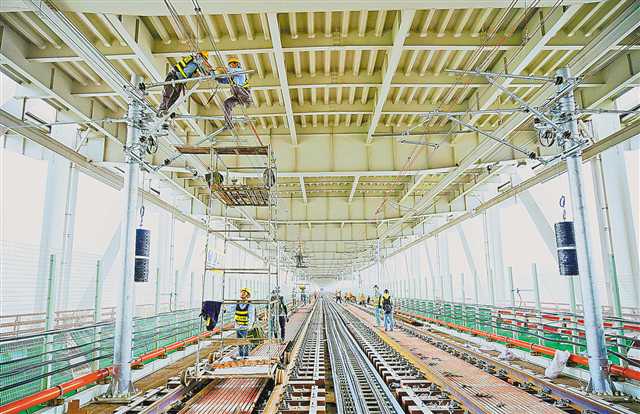 10月11日,軌道環(huán)線北半環(huán)朝天門長(zhǎng)江大橋段,建設(shè)工人正在進(jìn)行鋪軌后的機(jī)電安裝等施工。記者 羅斌 攝