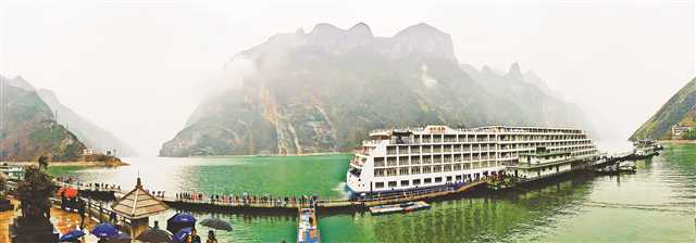2019年3月13日,在長(zhǎng)江三峽巫山境內(nèi)的巫峽,一艘豪華游輪?吭谏衽迓糜未a頭。通訊員 盧先慶 攝