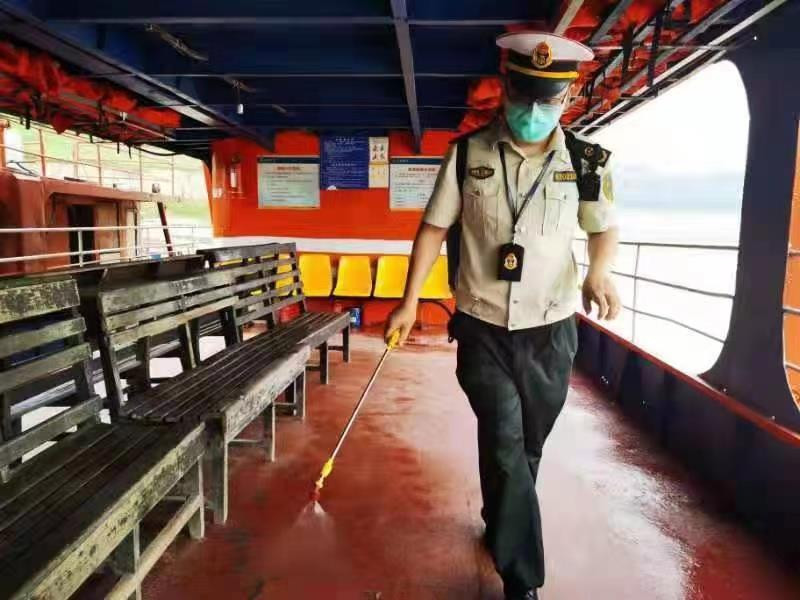 同時(shí),執(zhí)法人員看到澄江渡口的李船長(zhǎng)已年逾六旬,日常防疫消毒工作對(duì)他的身體是極大的考驗(yàn),于是背上消毒器具,有條不紊地對(duì)船體進(jìn)行消殺工作,用實(shí)際行動(dòng)為他減負(fù),并告知其澄江渡口檢查消殺工作都由他們承包。
