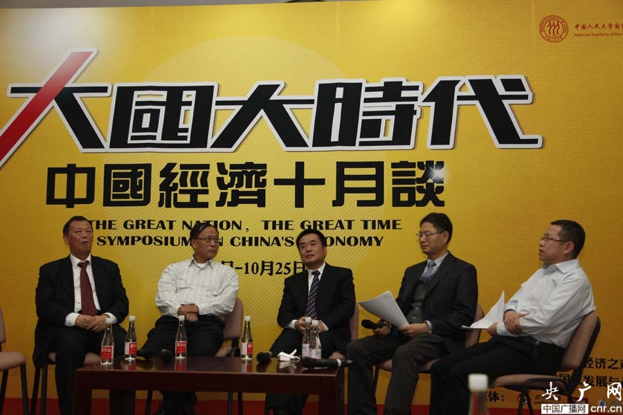 10月16日,由經(jīng)濟(jì)之聲、央廣網(wǎng)主辦的《大國(guó)大時(shí)代----中國(guó)經(jīng)濟(jì)十月談》系列時(shí)事報(bào)告會(huì)之四“價(jià)格談”,在人民大學(xué)舉行。圖為圖為國(guó)務(wù)院參事室特約研究員姚景源、國(guó)家信息中心首席經(jīng)濟(jì)師范劍平、國(guó)家發(fā)改委價(jià)格司副司長(zhǎng)周望軍、中國(guó)人民大學(xué)財(cái)政金融學(xué)院副院長(zhǎng)趙錫軍、經(jīng)濟(jì)之聲觀察員陳愛(ài)海(由左至右排序)(央廣網(wǎng) 趙娜娜/攝)