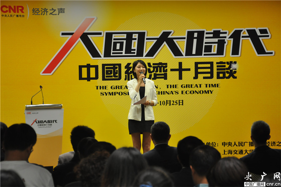 10月20日,由中央人民廣播電臺經(jīng)濟之聲、央廣網(wǎng)主辦的《大國大時代----中國經(jīng)濟十月談》系列時事報告會之五“貨幣談”,在位于中國人壽中心的上海交通大學(xué)上海高級金融學(xué)院舉行。今天的主題是《貨幣談:大國的錢怎么辦?》。圖為經(jīng)濟之聲主持人 梁靖(央廣網(wǎng) 李靜/攝)