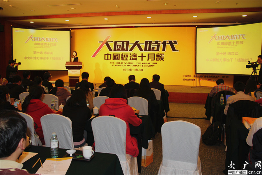 10月25日,由中央人民廣播電臺(tái)經(jīng)濟(jì)之聲、央廣網(wǎng)主辦的《大國大時(shí)代----中國經(jīng)濟(jì)十月談》系列時(shí)事報(bào)告會(huì)之十“博弈談”,在廣電國際酒店舉行。今天的主題是《博弈談:中央和地方事誰干?錢誰出》。圖為報(bào)告會(huì)現(xiàn)場 (央廣網(wǎng) 于琦/攝)