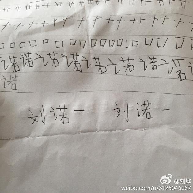 2月8日晚,劉燁[微博]更新微博曬教劉燁練字的照片,并寫道:“在家指導(dǎo)孩子練字,從名字開始,小諾進(jìn)步挺快的,但還是控制不好力道,我讓他寫了遍名字,我再寫一遍讓他看看差距。”照片中看出,諾一寫的是自己的名字,一次比一次寫得好,進(jìn)步很大,居然趕上爸爸劉燁的字跡了,非常的有天賦聰明。