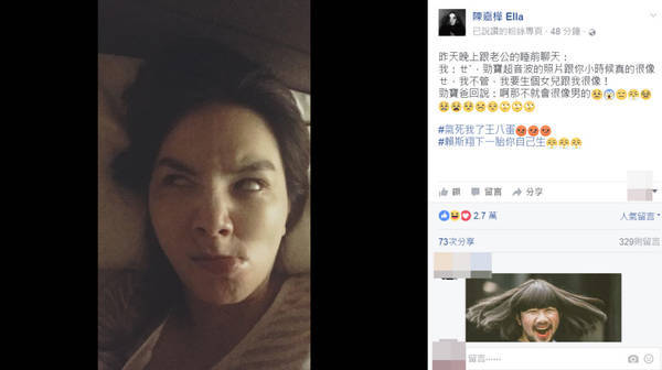 Ella睡前習(xí)慣和老公談天,她表示看完勁寶超聲波照片,直呼跟老公小時后長的相當(dāng)神似,便嬌羞跟老公預(yù)約要生第二胎,而且還是要生個長得很像的女兒,未料老公竟回“那不就會很像男的”,這讓Ella瞬間大動肝火,不僅大罵老公“王八蛋”,還指名道姓要他下胎自己生,對此粉絲直呼夫妻間的對話好可愛,根本就是在放閃。