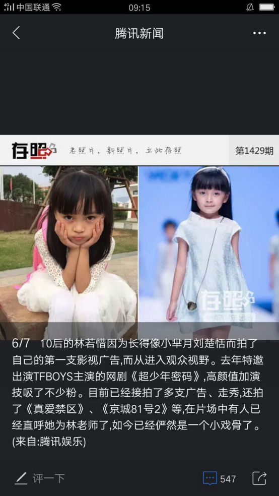 接著,小若惜接拍了首部院線電影《真愛禁區(qū)》并出演小女一號曉雨一角,因為先天領悟力強,臺詞功底好,表情到位,氣場足,在劇組秒變林老師了。這樣,小若惜迅速殺入影視圈,她沒有任何背景,她也無疑是這一眾10后中最努力的,她片約不斷勞模式地接拍了十多部影視劇和廣告,在柯震東等主演的民國諜戰(zhàn)劇《舞櫻》中出演小舞櫻.