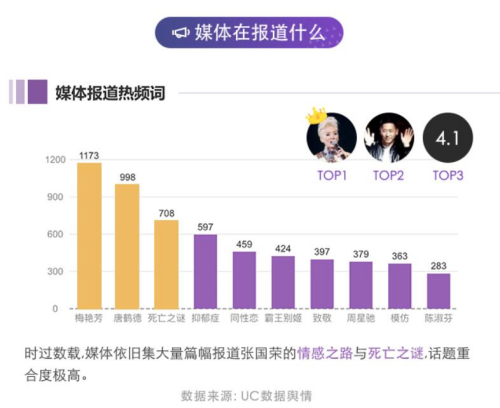 從大數(shù)據(jù)可以看到,張國榮離世14年,最受媒體關(guān)注的還是他身前的感情,以及死亡原因。排名前三的分別是梅艷芳、唐鶴德和死亡之謎。