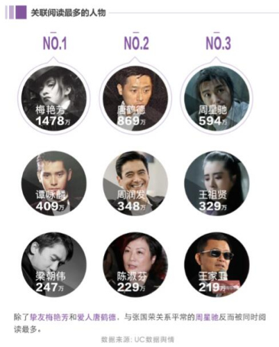 每當提到張國榮,大家總愛回憶他昔日的愛人、好友等,UC大數(shù)據(jù)顯示梅艷芳是粉絲緬懷張國榮時的閱讀熱頻詞和關(guān)聯(lián)閱讀最多的人物。同為香港傳奇巨星,互為摯友,張國榮和梅艷芳相隔8個月先后隕落。兩人命運何其相似,皆留給世人無盡芳華。同時,粉絲還較為關(guān)注與張國榮合作過的周星馳、王祖賢及初戀情人毛舜筠等人。