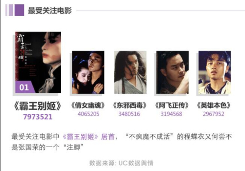 在最受關(guān)注的作品中,粉絲較為關(guān)注張國榮主演的《霸王別姬》《倩女幽魂》等電影和演唱的《風繼續(xù)吹》《當年情》等曲目。這些作品不僅在香港電影和流行歌曲的黃金時代中留有濃墨重彩的一筆,在中國文娛發(fā)展史上,皆有一席之地,堪稱經(jīng)典。據(jù)了解,張國榮在演《霸王別姬》時,被評價“把靈魂投入到了角色里”。不難理解,粉絲對其作品的高關(guān)注度,有其演繹直擊人心的原因。