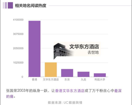 在UC相關(guān)地名閱讀熱度圖中顯示,除卻去世地香港文華酒店粉絲較為關(guān)注外,其長居地香港和演唱會舉辦地東京等,也成為粉絲緬懷他的地方。