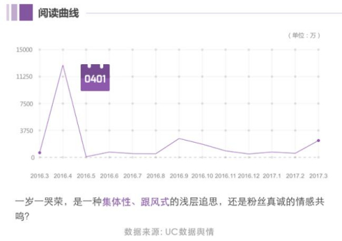 無獨有偶,UC閱讀數(shù)據(jù)圖也顯示,每年張國榮話題熱度的波峰是在4月1日前后,其余時間熱度較低,有粉絲表示“一歲一哭榮”已經(jīng)從一個忠實粉絲自發(fā)緬懷偶像的事件變成了一場自媒體和企業(yè)借勢的“營銷熱點”和網(wǎng)友跟風的淺層追思。