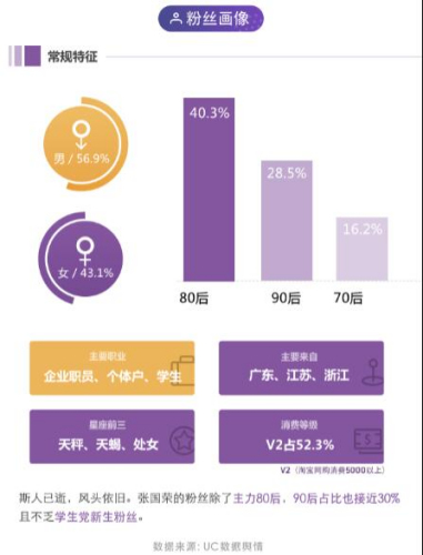 此次,UC根據(jù)粉絲所在地、年齡、性別等大數(shù)據(jù)提供了一份粉絲畫像。據(jù)大數(shù)據(jù)顯示,粉絲主要來自廣東等沿海城市,多為白領(lǐng)階層,淘寶網(wǎng)購消費水平較高。粉絲構(gòu)成中,90后不斷加入粉絲大軍,占比接近30%,其中,天秤座的粉絲最多。