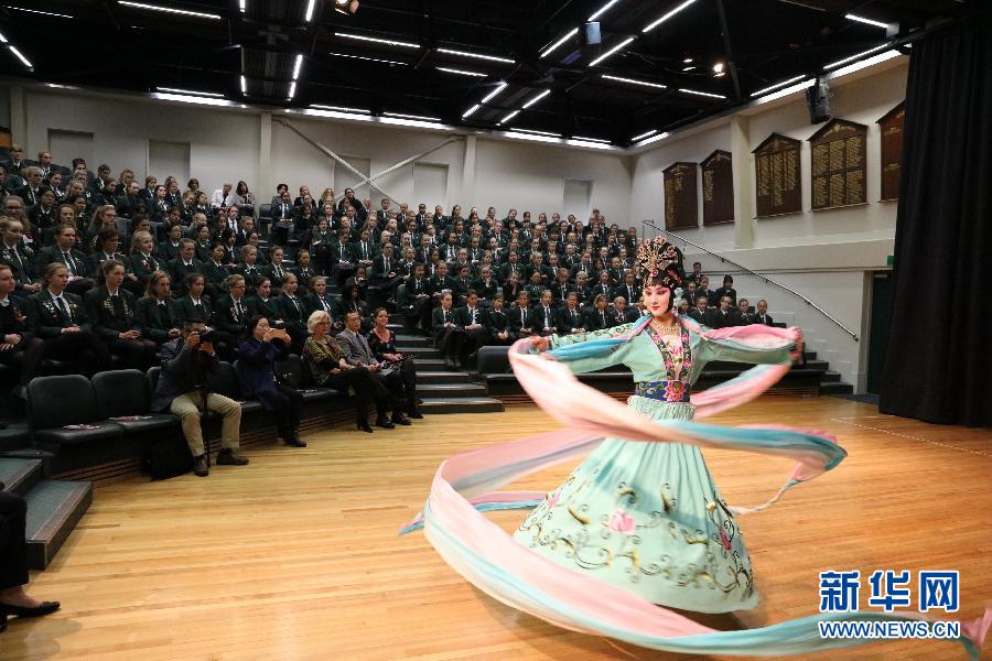 “2017年中國文化周”走進(jìn)新西蘭校園 5月8日,在新西蘭惠靈頓,黑龍江省京劇院演員在塞繆爾·馬斯丹女校表演京劇水袖。由新西蘭中國文化中心、黑龍江省文化廳舉辦的“2017年中國文化周”活動8日走進(jìn)新西蘭校園,中國京劇演員與惠靈頓塞繆爾·馬斯丹女校學(xué)生同臺表演。新華社發(fā)(孟韜攝)