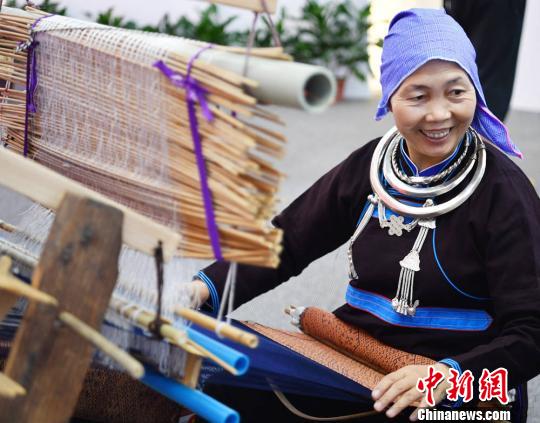 非遺傳承人粟田梅展示侗錦技藝!£愇 攝