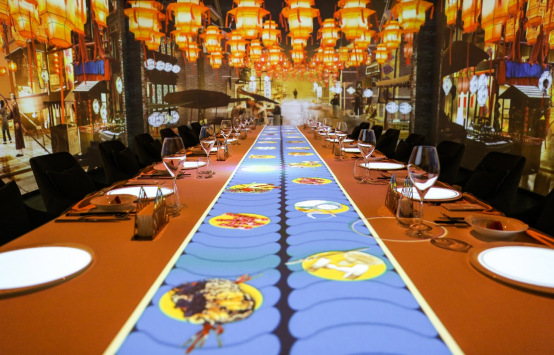 在技術(shù)層面,光影主題餐廳通過環(huán)形拼接和桌面投影的方式,在餐廳四圍及餐桌桌面進行激光投影。主題場景采用三維和二維動畫的視頻制作,并進行高清效果渲染,營造沉浸式的用餐環(huán)境。