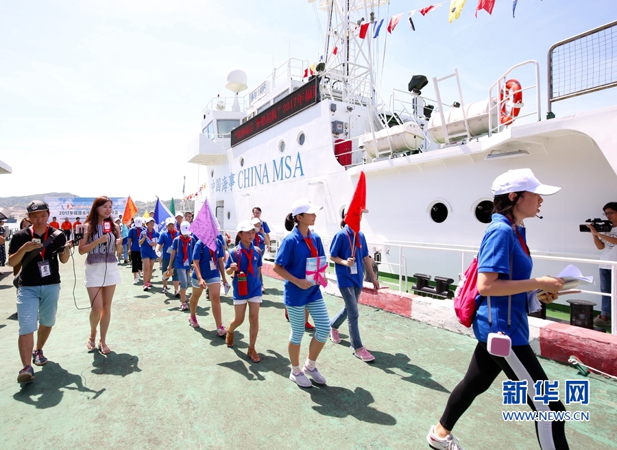 7月10日,小營員們走進(jìn)福州海事局海巡碼頭,參觀海事巡邏船“海巡0805”。 當(dāng)日,2017年福建省小學(xué)生航海夏令營在福州海事局海巡碼頭開營,共有來自福建6個地市的36名小學(xué)生參加,旨在增強(qiáng)小學(xué)生的水上安全意識,提高安全防范技能。 新華社記者 姜克紅 攝