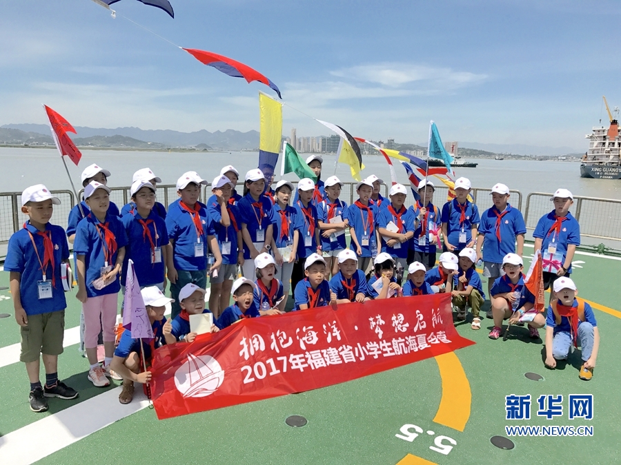 7月10日,小營員們在海事巡邏船“海巡0805”上參觀合影。 當(dāng)日,2017年福建省小學(xué)生航海夏令營在福州海事局海巡碼頭開營,共有來自福建6個地市的36名小學(xué)生參加,旨在增強(qiáng)小學(xué)生的水上安全意識,提高安全防范技能。 新華社記者 姜克紅 攝