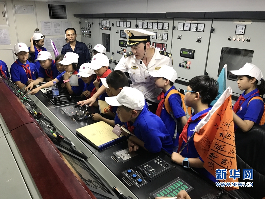 7月10日,小營員們在福州參觀海事巡邏船“海巡0805”內(nèi)部控制室。 當(dāng)日,2017年福建省小學(xué)生航海夏令營在福州海事局海巡碼頭開營,共有來自福建6個地市的36名小學(xué)生參加,旨在增強(qiáng)小學(xué)生的水上安全意識,提高安全防范技能。 新華社記者 姜克紅 攝