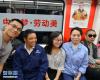 5月1日,全國勞模吳曉紅(右二)、劉志堂(左二)在“勞模地鐵專列”車廂內(nèi)與乘客合影。 “五一”勞動節(jié)期間,一列“勞模地鐵專列”亮相長沙地鐵1號線。該列車在車廂內(nèi)集中展示了由全國勞模、攝影家謝子龍拍攝的88位不同崗位全國勞模的肖像作品,旨在展示“勞動最光榮、勞動最崇高、勞動最偉大、勞動最美麗”的精神。新華社發(fā)(陳思維 攝)